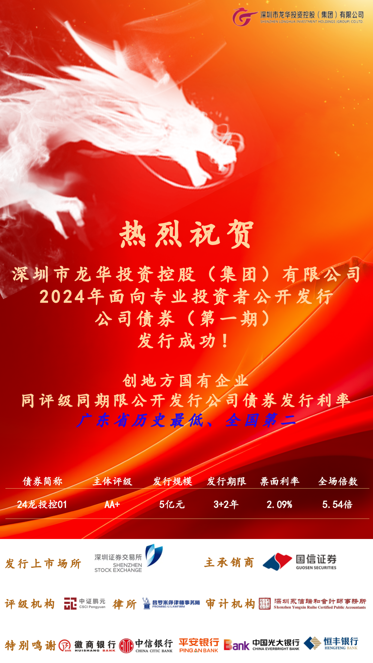 喜报!龙华投控集团首次成功发行公司债券,票面利率创新低